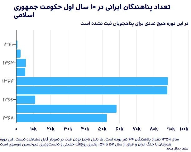 در مجموع این ۱۰ سال بیش از ۳۱۲ هزار ایرانی پناهنده شدند. سال ۱۳۶۴ با ثبت بیش از ۸۸ هزار پناهنده، بالاترین نرخ پناهندگی را در این ۱۰ سال به خود اختصاص داده است.