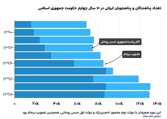 بر خلاف دورههای پیشین، از سال ۱۳۹۲ و آغاز ریاستجمهوری حسن روحانی، روند پناهندگی ایرانیان نه تنها کاهش نیافت، بلکه صعودی باقی ماند.
