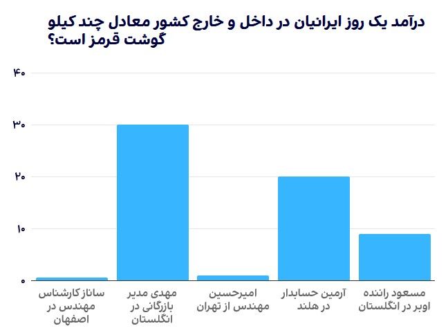 ایراناینترنشنال از چند ایرانی در مشاغل مختلف در داخل ایران و خارج از کشور، سوالاتی یکسان پرسیده است. از جمله این که درآمد یک روز آنان برابر چه اندازه گوشت قرمز در محل زندگیشان است.