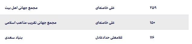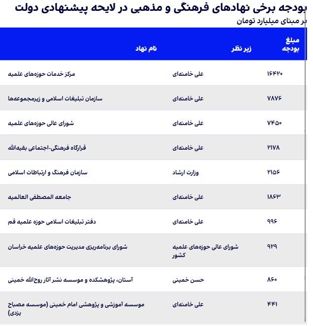 از «موسسه پژوهشی و فرهنگی انقلاب اسلامی» وابسته به دفتر خامنهای با ۳۵۰ میلیارد تومان گرفته تا «پژوهشگاه فرهنگ و اندیشه اسلامی» با ۱۴۴ میلیارد تومان، «شورای سیاستگذاری ائمه جمعه» با ۴۹۶ میلیارد تومان، «مرکز رسیدگی به امور مساجد» با ۱۵۰ میلیارد تومان، «ستاد اقامه نماز» با ۱۴۰ میلیارد تومان، «مرکز تحقیقات کامپیوتری علوم اسلامی» با ۱۹۱ میلیارد تومان، «مرکز الگوی اسلامی-ایرانی پیشرفت» با ۴۶ میلیارد تومان، «حوزه هنری» با ۱۳۵۰ میلیارد تومان و «ستاد سازمان تبلیغات اسلامی» با ۳۷۰۰ میلیارد تومان.