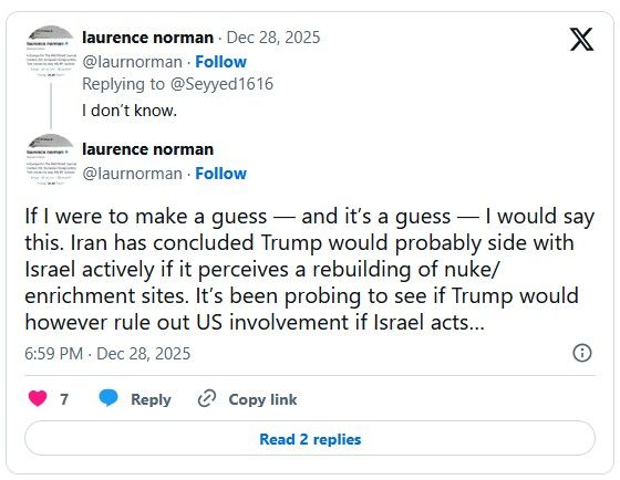 لارنس نورمن، خبرنگار «والاستریت ژورنال» که پرونده هستهای ایران را تعقیب و گزارش میکند، گفت: «به نظر من ایران به این نتیجه رسیده که اگر دونالد ترامپ احساس کند تاسیسات هستهای یا غنیسازی در حال بازسازی است، به احتمال زیاد بهطور فعال در کنار اسرائیل خواهد ایستاد. در عین حال، تهران در حال محکزدن این بود که آیا آقای ترامپ، در صورتی که اسرائیل علیه بازسازی یا تقویت توان موشکی ایران اقدام کند، دخالت آمریکا را منتفی میداند یا نه.»