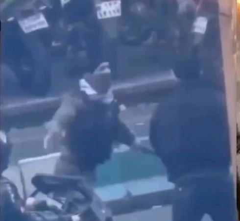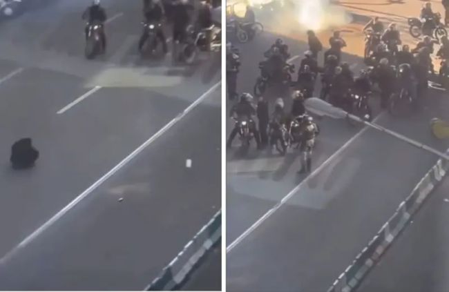 مردی که در ویدیو دیده میشود، وسط خیابان نشسته است، سرش را پایین انداخته و کاپشنش را روی سرش میکشد. حدود ۲۷ نیروی یگان ویژه بر ترک موتور یا ایستاده مقابل او دیده میشوند.