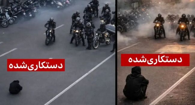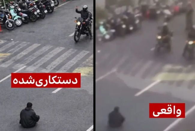 دو اسکرینشات از ویدیوی مردی که وسط خیابان مقابل نیروهای یگان ویژه نشسته استویدیو کیفیت چندان خوبی ندارد اما بهسرعت اسکرینشاتهایی از این ویدیو که اغلب با هوش مصنوعی کیفیتش بالا رفته و دستکاری شده بود، منتشر شد.در مواردی کاربران اسکرینشاتهای دستکاری شده را به عنوان تصویر واقعی منتشر کردند.