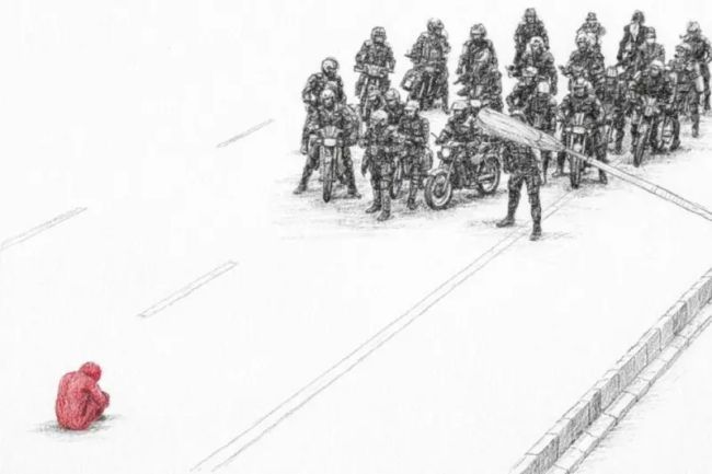 تصویر هنری الهام گرفته از مرد معترضی که وسط خیابان نشسته بود که در شبکههای اجتماعی منتشر شد۴۶