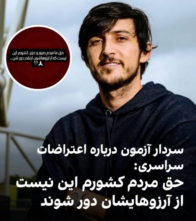 سردار آزمون، بازیکن تیم ملی فوتبال در واکنش به اعتراضات سراسری در ایران با انتشار یک استوری نوشت: «حق ما مردم صبور و عزیز کشورم این نیست که از آرزوهاشون اینقدر دور شن.»پس از افزایش قیمت دلار در ایران، در روزهای گذشته تجمعات اعتراضی در شهرهای ایران برگزار و شعارهایی علیه حکومت و مقامات جمهوری اسلامی داده شد.