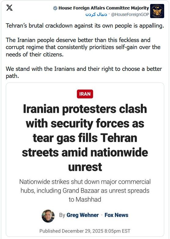 جو ویلسون، عضو ارشد جمهوریخواه مجلس نمایندگان ایالات متحده نیز در ایکس نوشت که از معترضان در ایران حمایت میکند و به سرنوشت بشار اسد و پایان دیکتاتوری در سوریه با فرار او به مسکو اشاره کرد.