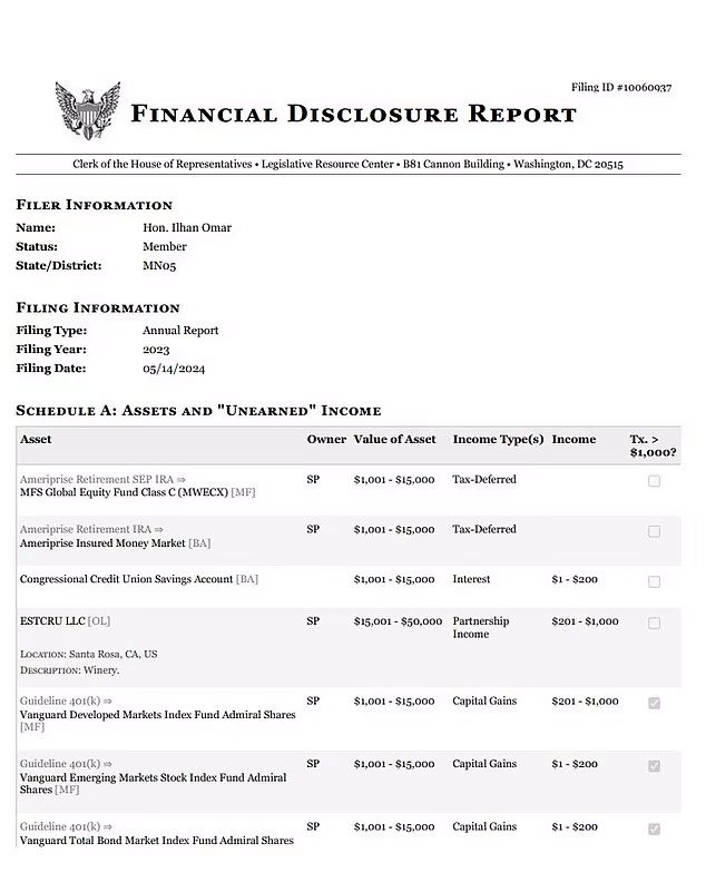در همان گزارش، این سیاستمدار سوسیالیستِ متولد سومالی اعلام کرده بود که شرکت دیگری با نام ESTCRU LLC به ارزشی بین ۱۵٬۰۰۱ تا ۵۰٬۰۰۰ دلار دارد. این شرکت یک کارخانه شرابسازی در شهر سانتا روزا در ایالت کالیفرنیاست. اما بر اساس اسناد مالی جدید عمر، ارزش این شرکت اکنون بین ۱ تا ۵ میلیون دلار ثبت شده است.