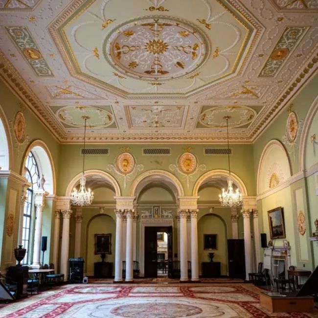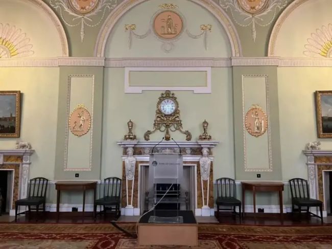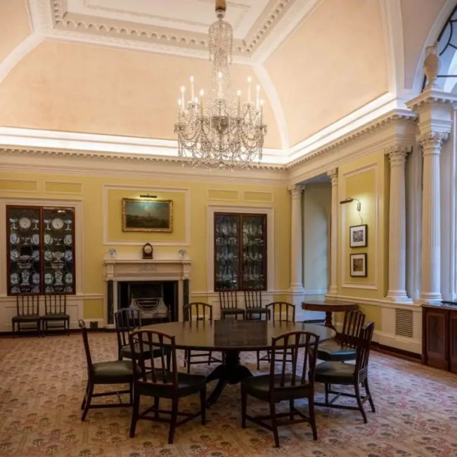 از این اتاق، درهای چوبی ضخیم و دولنگهای باز میشوند که به فضایی هشتضلعی با رنگ آبی روشن و لوکس راه دارد؛ جایی که پرتره یکی از مدیران پیشین با نگاه نافذش بر فضای بازسازیشده از دهه ۱۷۸۰ مسلط است.