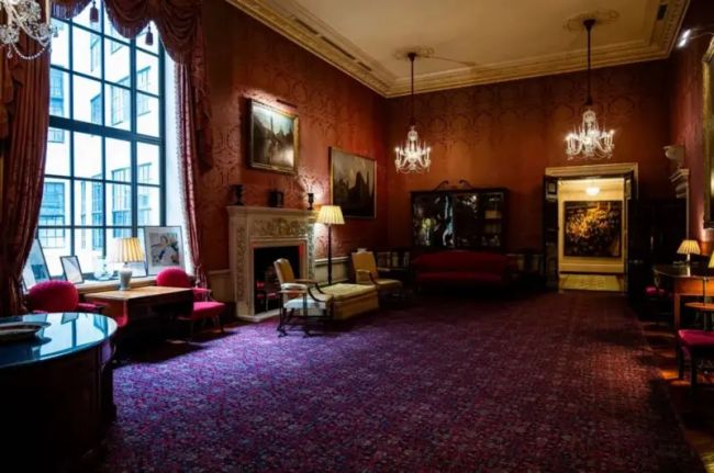 یکی از این فضاها، اتاق انتظار طبقه اول است که با پارچههای ابریشمی قرمز و طلایی پوشیده شده، نقاشیهایی چند صد ساله بر دیوارها آویزان است و کنار پنجرهای عظیم که از کف تا سقف امتداد دارد، شومینهای با تزئینات بسیار ظریف قرار گرفته است.