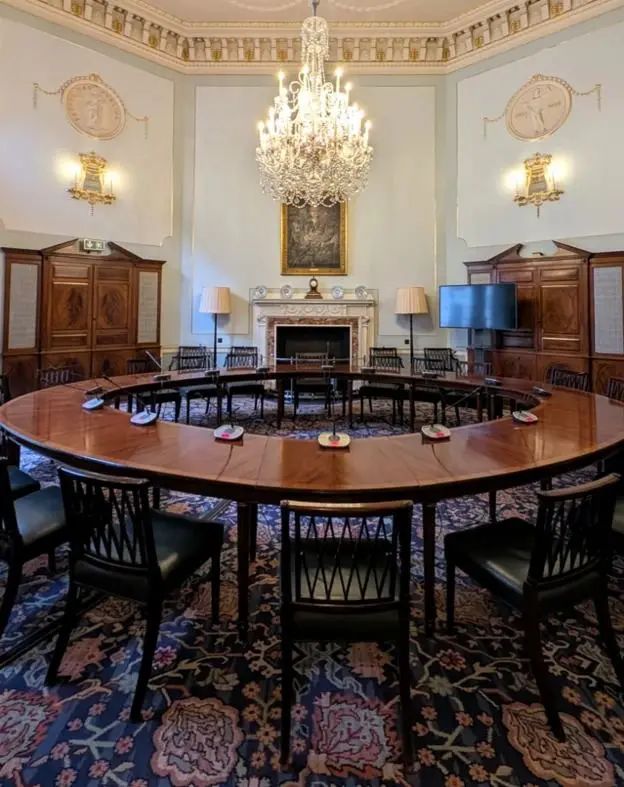 تصمیمگیری درباره نرخ بهره بانک انگلستان هر ماه در اتاق کمیته انجام میشودحس بنای باشکوهی با رگههایی از مدرنیته در سراسر این طبقه ادامه دارد؛ بسیاری از عناصر سنگی ساختمان قبلی از جمله شومینهها و ستونها دوباره مورد استفاده قرار گرفتهاند.در آنسوی مجموعهای دیگر از درهای دو جداره، اتاق جلسات رسمی قرار دارد که تریبونی با نشان بانک انگلستان در مقابل شومینهای متعلق به قرن هجدهم دارد و زیر سقفی سبز و پیچیده و دیوارهایی که با طلا آراسته شدهاند قرار گرفته است.