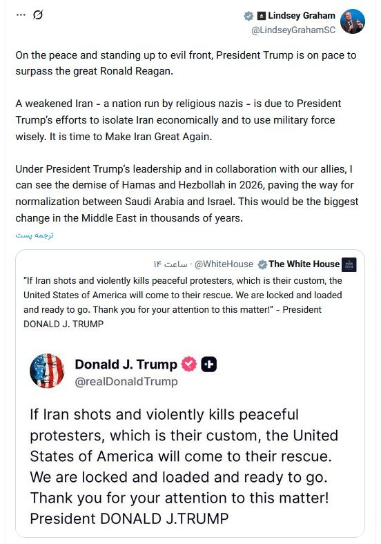 در مقابل، لیندزی گراهام، سناتور جمهوریخواه و حامی آقای ترامپ نوشت: «ایران تضعیفشده، کشوری که توسط نازیهای مذهبی اداره میشود، نتیجه تلاشهای دونالد ترامپ برای منزوی کردن اقتصاد ایران و استفاده خردمندانه از نیروی نظامی است. وقت آن است که عظمت را به ایران بازگردانیم.»