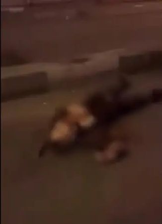 در ویدیو کنار مردی که وسط خیابان افتاده، جدولهای سبز و سفید دیده میشود و در انتهای خیابان هم نورپردازیهای یک میدان قابل مشاهده است.