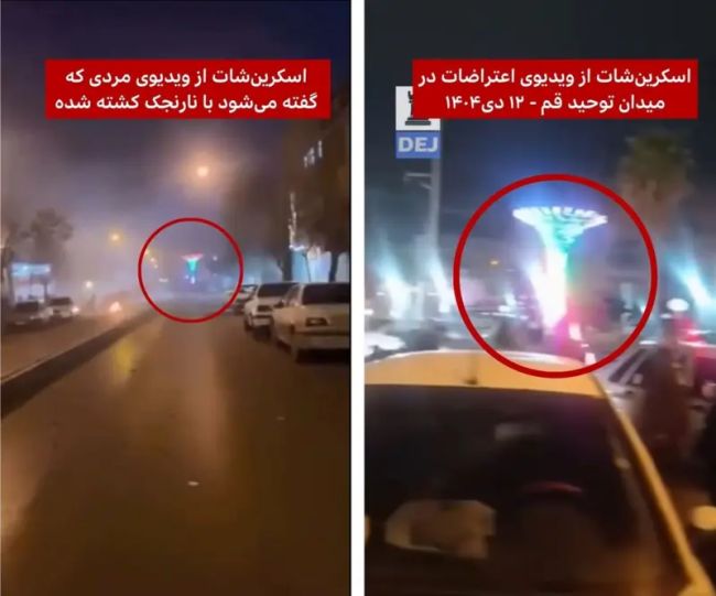 اسکرینشاتی از ویدیوی مردی که گفته میشود با نارنک کشته شده استشب گذشته ویدیویی دیگری از اعتراضات در میدان توحید قم منتشر شد که نورپردازی میدان شبیه به آنچه در ویدیوی مردی که گفته میشود با نارنجک کشته شده، همخوانی دارد.