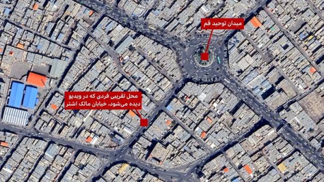 نورپردازی میدان توحید قم در ویدیوی مردی که کشته شده، شبیه به ویدیوهای دیگری است که از اعتراضات این منطقه منتشر شده استبررسیهای ما نشان میدهد این ویدیو در خیابان مالک اشتر و نزدیک میدان توحید قم گرفته شده است.
