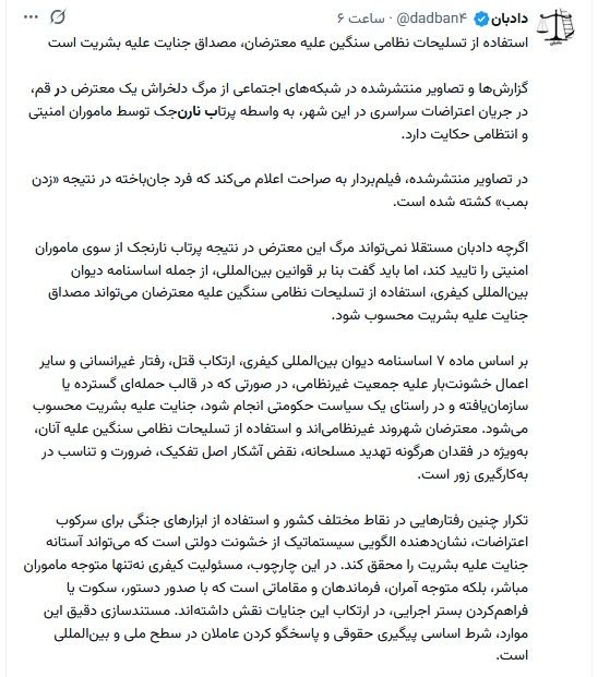 استفاده از تسلیحات نظامی سنگین علیه معترضان، مصداق جنایت علیه بشریت است