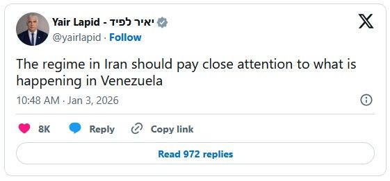 یائیر لاپید، نخستوزیر پیشین و رهبر اپوزیسیون اسرائیل در شبکه اجتماعی ایکس نوشت: «رژیم ایران باید با دقت به آنچه در ونزوئلا میگذرد، توجه کند.»