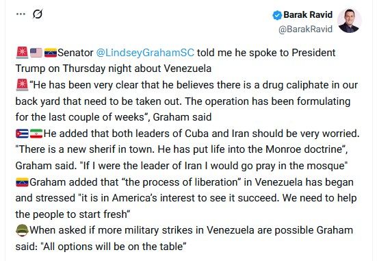 لیندزی گراهام، سناتور جمهوریخواه در گفتگو با اکسیوس گفت که پنجشنبه شب درباره عملیات ونزوئلا با دونالد ترامپ گفتگو کرده است.