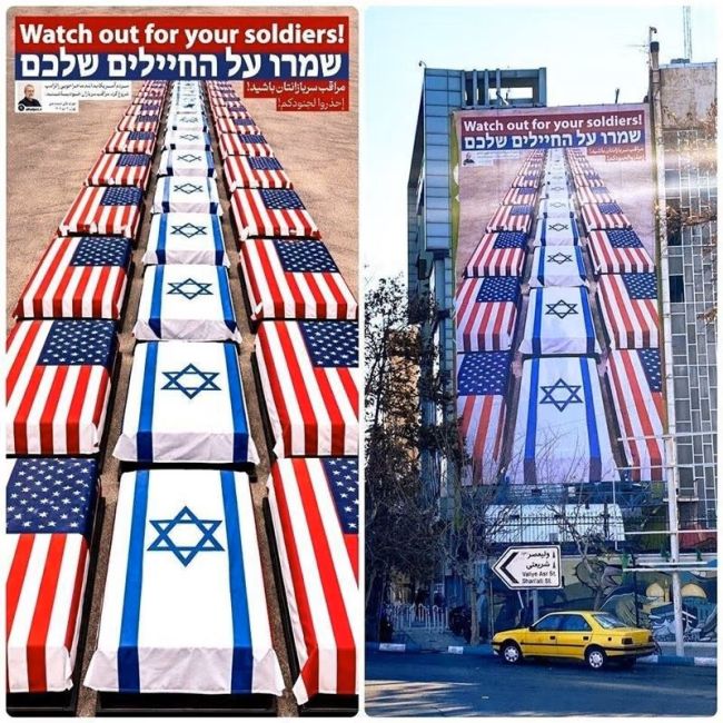 در پی هشدار ترامپ به جمهوری اسلامی درباره سرکوب معترضان، و واکنش مقامهای ایران به آن، دیوارنگاره جدیدی در میدان «فلسطین» تهران نصب شده که در آن حکومت ایران به کشتن سربازان آمریکایی و اسرائیلی تهدید کرده است.