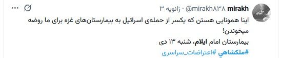 بنا به گزارش نهادهای حقوق بشری، شماری از معترضان شهر ملکشاهی که طی روزهای گذشته بر اثر تیراندازی مستقیم نیروهای امنیتی زخمی شده بودند، به بیمارستان امام خمینی ایلام منتقل شده اند و وضعیت تعدادی از مجروحان وخیم گزارش می شود. pic.twitter.com/0W0ITiwytc