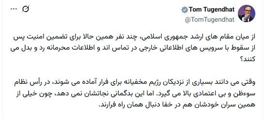 تام توگنهات، نماینده حزب محافظهکار در پارلمان و معاون وزیر کشور دولت پیشین بریتانیا شامگاه شنبه با انتشار پیامی به زبان فارسی در شبکه اجتماعی ایکس نوشت: «از میان مقامات ارشد جمهوری اسلامی، چند نفر همین حالا برای تضمین امنیت پس از سقوط با سرویسهای اطلاعاتی خارجی در تماساند و اطلاعات محرمانه ردوبدل میکنند؟»