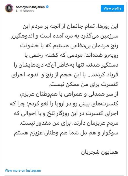 همایون شجریان گفت برای همراهی با اعتراضات کنسرتش در اروپا را لغو کرده است.خواننده سرشناس در شبکه اجتماعی اینستاگرام نوشت: «این روزها، تمام جانمان از آنچه بر مردم این سرزمین میگذرد به درد آمده است.»
