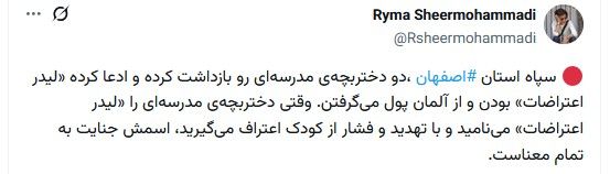 �"� سپاه استان #اصفهان ،دو دختربچهی مدرسهای رو بازداشت کرده و ادعا کرده «لیدر اعتراضات» بودن و از آلمان پول میگرفتن. وقتی دختربچهی مدرسهای را «لیدر اعتراضات» مینامید و با تهدید و فشار از کودک اعتراف میگیرید، اسمش جنایت به تمام معناست.