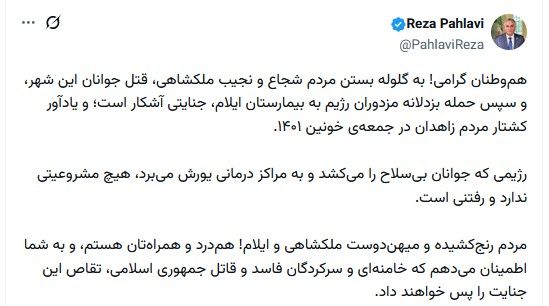 در همین حال، شاهزاده رضا پهلوی ولیعهد پیشین ایران در پستی در شبکه ایکس با اشاره به این سرکوبها نوشت: «به گلوله بستن مردم شجاع و نجیب ملکشاهی، قتل جوانان این شهر، و سپس حمله بزدلانه مزدوران رژیم به بیمارستان ایلام، جنایتی آشکار است؛ و یادآور کشتار مردم زاهدان در جمعه خونین ۱۴۰۱».