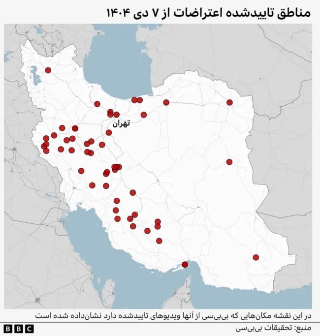 بی بی سی: تحقیق مشترک بیبیسی فارسی و بیبیسی وریفای (بخش راستیآزمایی بیبیسی) نشان میدهد اعتراضها به دستکم ۱۷ استان از ۳۱ استان ایران گسترش یافته، و به بزرگترین چالش حاکمیت از زمان اعتراضهای سراسری سال ۱۴۰۱ تبدیل شده است.پژوهش بیبیسی تنها شامل اعتراضاتی است که ویدیوهای تاییدشدهای از آنها در دست بوده است. تقریبا به طور قطع میتوان گفت که شمار واقعی اعتراضها بسیار بیشتر است و گزارشهایی از اعتراضات در ۱۱ استان دیگر نیز منتشر شده است.