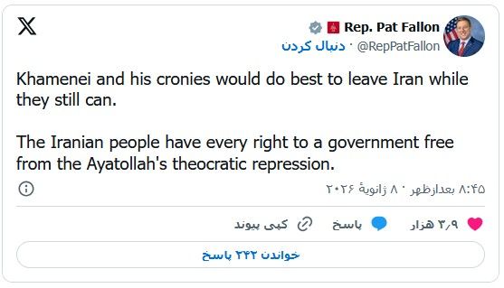 کنگره آمریکا - آرشیوپت فالون، قانونگذار مجلس نمایندگان آمریکا از ایالت تگزاس، روز پنجشنبه به علی خامنهای، رهبر جمهوری اسلامی پیام داد که «بهتر است» ایران را ترک کند.آقای فالون در بیانیهای که همزمان با گسترش اعتراضات ضدحکوتی در ایران، در شبکه اجتماعی ایکس منتشر کرد، گفت «خامنهای و نزدیکانش بهتر است تا زمانی که میتوانند (فرصد دارند) ایران را ترک کنند.»