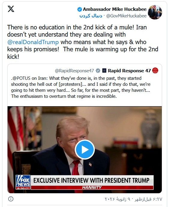 مایک هاکبی، سفیر آمریکا در اسرائیل، در حساب ایکس خود ضمن بازنشر هشدار دوباره ترامپ به جمهوری اسلامی درباره برخورد با معترضان، نوشت که جمهوری اسلامی هنوز درک نکرده با چه کسی طرف است.