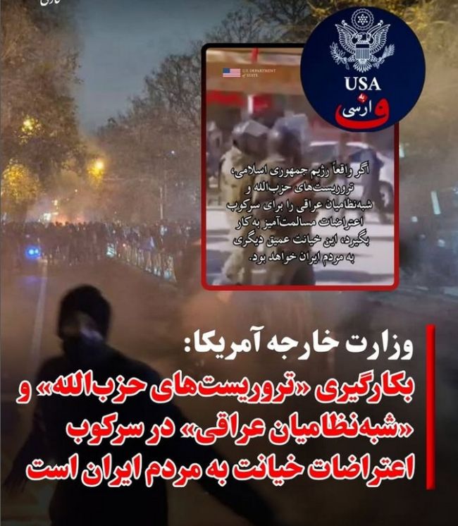 حساب رسمی وزارت امور خارجه آمریکا به زبان فارسی در شبکه اجتماعی اکس روز شنبه ۲۰ دی با انتشار تصویری از نیروهای سرکوبگر جمهوری اسلامی نوشت: «ایالات متحده نگران گزارشهایی است که رژیم جمهوری اسلامی، تروریستهایی از حزبالله و شبهنظامیان عراقی را برای سرکوب اعتراضات مسالمتآمیز به کار گرفته است.»