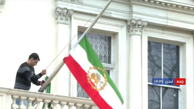 پایین کشیدن پرچم سفارت جمهوری اسلامی ایران در لندن و نصب پرچم شیر و خورشید بهجای آن