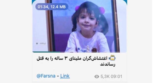 خبرگزاری «فارس» وابسته به سپاه پاسداران جمهوری اسلامی، شنبه ۲۰دی۱۴۰۴ با انتشار ویدیویی از خبرگزاری صداوسیما مدعی شد که در جریان اعتراضات شامگاه جمعه ۱۹دی، یک کودک سه ساله به نام «ملینا» در کرمانشاه به دست «اغتشاشگران» کشته شده است. در این ویدیو فردی که پدر ملینا معرفی میشود در حال گریه میگوید فرزندش از پشت تیر خورده است و تصاویر او را در تلفن همراه خود نشان میدهد.