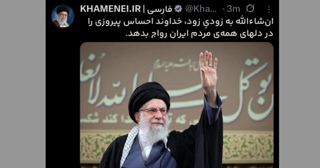 در پی بالا گرفتن گمانهزنیها درباره احتمال حمله نظامی ایالات متحده در حمایت از معترضان ایرانی، حساب کاربری «علی خامنهای» در شبکه اجتماعی «ایکس» با انتشار عکسی از او در حال دست تکان دادن برای طرفدارانش، نوشت: «انشالله بهزودیِزود، خداوند احساس پیروزی را در دلهای همه مردم ایران رواج دهد.»این توییت در حالی منتشر شده که در ساعات اولیه بامداد یکشنبه ۲۱دیماه به وقت ایران، چندین مقام آمریکایی درباره حمایت ایالات متحده از معترضان ایرانی اظهارنظر کردهاند.