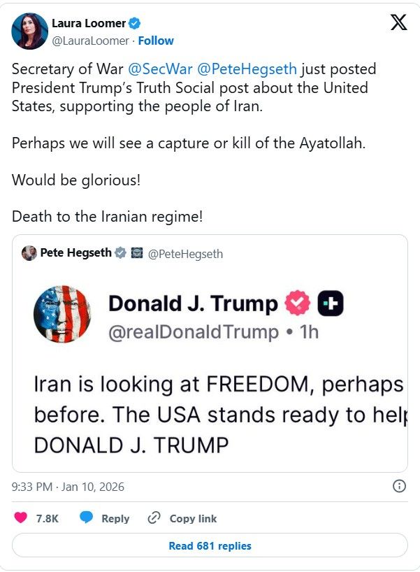 ایندیپندنت فارسی - لورا لومر، فعال سیاسی نزدیک به دونالد ترامپ با بازنشر پیام دونالد ترامپ که در آن گفته «ایران به آزادی چشم دوخته، شاید نزدیکتر از هر زمان دیگری و آمریک آماده کمک است»، نوشت:«شاید شاهد کشته شدن یا دستگیری آیتالله (خامنهای) باشیم. عالی خواهد بود.» او گفت: «مرگ بر رژیم ایران»