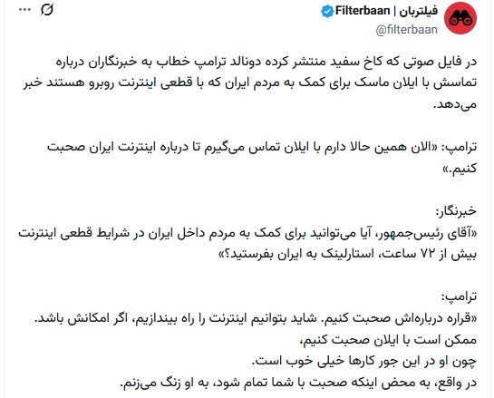 بر اساس فایل صوتی منتشر شده از سوی کاخ سفید، دونالد ترامپ، رئیسجمهوری آمریکا، در گفتگو با خبرنگاران گفت که قصد دارد برای برقراری دسترسی ایرانیان داخل کشور به اینترنت با ایلان ماسک، مالک شرکت اسپیساکس گفتگو کند.آقای ترامپ در پاسخ به پرسش خبرنگاران مبنی بر اینکه «آیا میتوانید برای کمک به مردم ایران که بیش از ۷۲ ساعت است در قطعی کامل به سر میبرند، تجهیزات استارلینک بفرستید؟» گفت: «در واقع به محض اینکه صحبت با شما تمام شود، با ایلان تماس میگیرم تا درباره اینترنت ایران صحبت کنیم. او در این جور کارها خیلی خوب است و شاید بتوانیم اگر امکانش باشد، اینترنت را دوباره راه بیندازیم.»