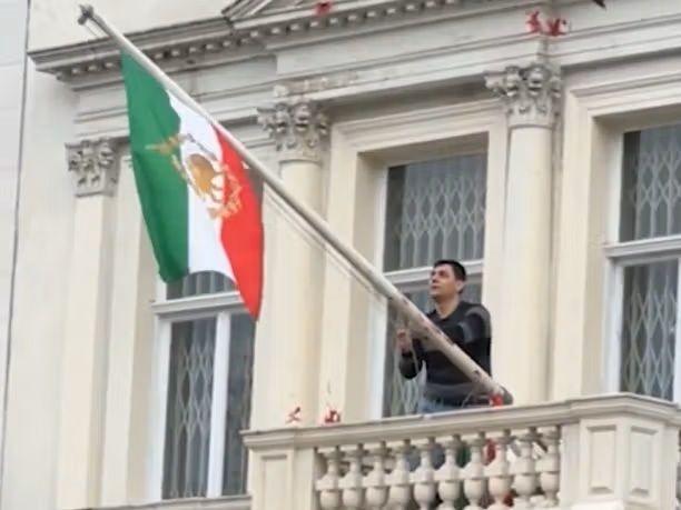 بر اساس ویدیوی رسیده به ایراناینترنشنال، گروهی از ایرانیان مقیم بریتانیا، دوشنبه ۲۲ دی پرچم جمهوری اسلامی را از سفارت آن در لندن پایین کشیده و پرچم شیر و خورشید را برافراشتند. pic.twitter.com/gAE0gqFGjE