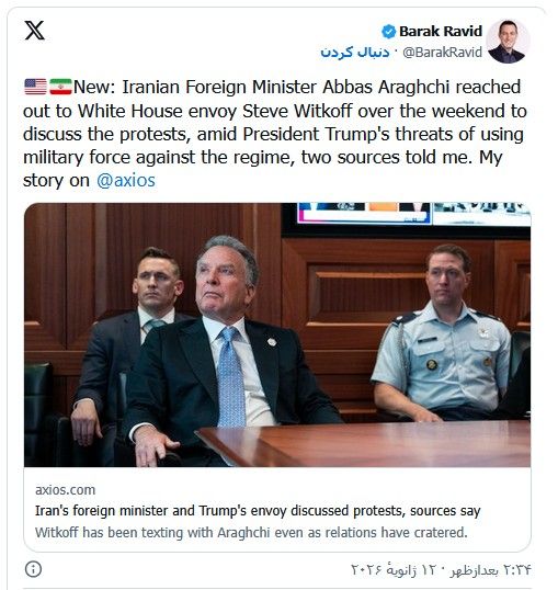 باراک راوید، خبرنگار اکسیوس، روز دوشنبه ۲۲ دی خبر داد که عباس عراقچی، وزیر خارجه ایران، آخر هفته گذشته برای گفتوگو درباره اعتراضات با استیو ویتکاف، نماینده ویژه کاخ سفید، تماس گرفت.راوید به نقل از «دو منبع» در شبکه اجتماعی ایکس نوشت این تماس پس از آن صورت گرفت که رئیسجمهور ترامپ رژیم جمهوری اسلامی را به استفاده از نیروی نظامی تهدید کرد.