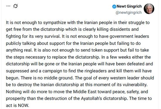 نیوت گینگریچ در پایان با تأکید مجدد بر اینکه «همین الان» وقت عمل است، خاطرنشان کرده که هیچ چیز بیشتر از نابودی «دیکتاتوری آیتالله»، خاورمیانه را به سمت صلح، امنیت و رفاه سوق نمیدهد.