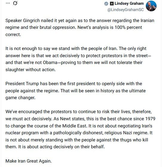 آقای گراهام در ایکس نوشت: «دونالد ترامپ، اوباما نیست. او نخستین رئیس جمهور ایالات متحده است که به روشنی در کنار مردم ایران و در مقابل رژیم جمهوری اسلامی ایستاده است؛ اقدامی که- به گفته او- «در تاریخ به عنوان تصمیمی سرنوشتساز» ثبت خواهد شد.
