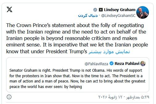 در پاسخ به نوشته لیندزی گراهام، شاهزاده رضا پهلوی هم در ایکس نوشته که «سناتور گراهام به درستی یادآوری کرده که ترامپ، اوباما نیست و این از سخنانش در حمایت از مردم ایران، مشخص است».