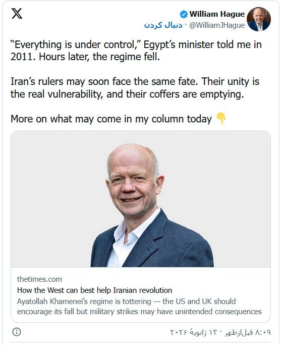 ویلیام هیگ، وزیر خارجه پیشین بریتانیا در واکنش به تشدید تنشها و سرکوب معترضان در ایران با انتشار پیامی بر ضرورت پاسخگویی بینالمللی تاکید کرد. او در موضعگیری خود خاطرنشان کرد که تماشای خشونت علیه مردم بیدفاع که برای حقوق بنیادین خود تلاش میکنند، غیرقابل قبول است و جامعه جهانی نباید در برابر این سطح از سرکوب سکوت اختیار کند. هیگ همچنین اشاره کرد که رویکرد فعلی مقامهای ایران تنها به انزوای بیشتر آنها منجر خواهد شد و از دولتهای دموکراتیک خواست تا همبستگی صریح خود را با خواستههای مشروع مردم ایران نشان دهند. او بر این نکته تاکید کرد که دیپلماسی بینالمللی باید به جای تماشا، اقدامات مؤثری را برای توقف فوری خشونتها و حمایت از آزادیهای مدنی در این مقطع حساس به کار گیرد.