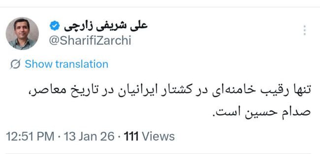علی شریفی زارچی، استاد دانشگاه در صفحه خود نوشت: تنها رقیب خامنهای در کشتار ایرانیان در تاریخ معاصر، صدام حسین است.
