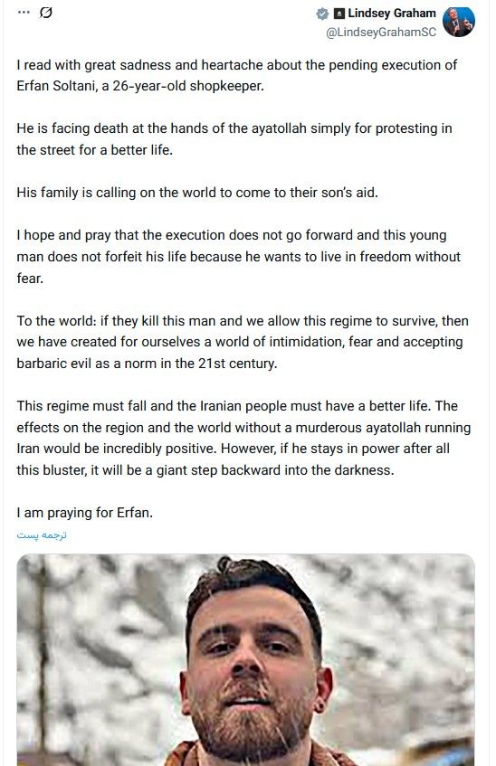 اعتراضات سراسری ۱۴۰۴ در ایرانلیندسی گراهام، سناتور جمهوریخواه ایالت کارولینای شمالی، روز شنبه ۲۷ دی با انتشار پیامی در حساب کاربری خود در شبکه اجتماعی «ایکس»، نسبت به خطر اعدام قریبالوقوع یک جوان معترض ایرانی هشدار داد.سناتور گراهام در این پیام با ابراز نگرانی در مورد «خطر اعدام قریبالوقوع عرفان سلطانی، مغازهدار ۲۶ ساله»، نوشته است: «او صرفاً به دلیل اعتراض در خیابان برای زندگی بهتر، با خطر مرگ توسط آیتالله روبرو است.»