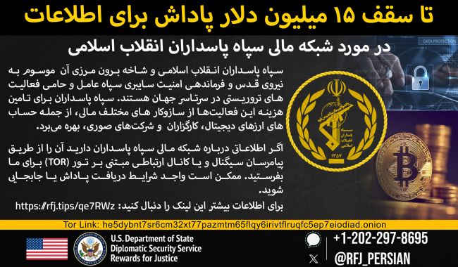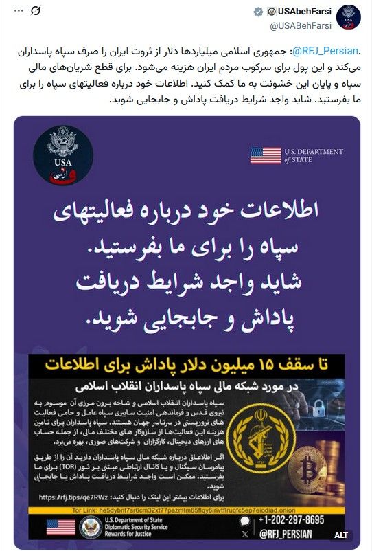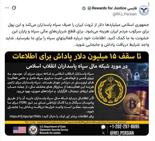 حساب وزارت خارجه آمریکا در شبکههای ایکس و اینستاگرام از کاربران فارسی زبان خواست تا در مورد «فعالیتهای سپاه» به این وزارتخانه اطلاعات بدهند تا «شاید واجد شرایط دریافت پاداش و جابجایی» بشوند.در بخشی از پیام وزارت خارجه آمریکا آمده است: «جمهوری اسلامی میلیاردها دلار از ثروت ایران را صرف سپاه پاسداران میکند و این پول برای سرکوب مردم ایران هزینه میشود. برای قطع شریانهای مالی سپاه و پایان این خشونت به ما کمک کنید.»