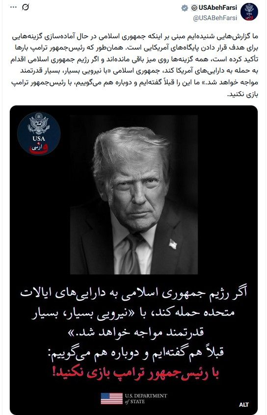 حساب فارسی وزارت خارجه آمریکا در شبکه ایکس روز شنبه ۲۷ دیماه نوشت: «ما گزارشهایی شنیدهایم مبنی بر اینکه جمهوری اسلامی در حال آمادهسازی گزینههایی برای هدف قرار دادن پایگاههای آمریکایی است. همانطور که رئیسجمهور ترامپ بارها تاکید کرده است، همه گزینهها روی میز باقی ماندهاند و اگر رژیم جمهوری اسلامی اقدام به حمله به داراییهای آمریکا کند، جمهوری اسلامی با نیرویی بسیار، بسیار قدرتمند مواجه خواهد شد. ما این را قبلا گفتهایم و دوباره هم میگوییم: با رئیسجمهور ترامپ بازی نکنید.»