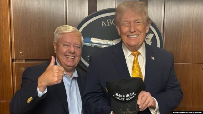 سناتور جمهوریخواه آمریکایی، لیندزی گراهام در کنار دونالد ترامپ، رئیس جمهوری آمریکا که کلاه «ایران را دوباره با عظمت کن» را در دست دارد.سناتور جمهوریخواه آمریکایی، لیندزی گراهام به مصاحبه روز شنبه رئیس جمهوری آمریکا، دونالد ترامپ با پولتیکو که در مورد ایران و علی خامنهای سخن گفت و بیان کرد که باید به دنبال رهبری تازهای بود واکنش نشان داد. آقای گراهام گفت دونالد ترامپ را «بزرگتر از ریگان» و بهتر از او خواند.آقای گراهام که به اسرائیل سفر کرده است همچنین روز شنبه در سکوی شبکه اجتماعی ایکس نوشت «خطاب به کسانی در آمریکا و سراسر جهان که فکر میکنند کشور ما با نادیده گرفتن مردم رنجکشیده ایران آسیب نمیبیند — مردمی که در حالی که خواستار پایان ستم هستند سلاخی میشوند و در عین حال اجازه میدهند آخوندها بار دیگر از این جنایتها جان سالم به در ببرند — باید گفت شما سادهلوح هستید.»