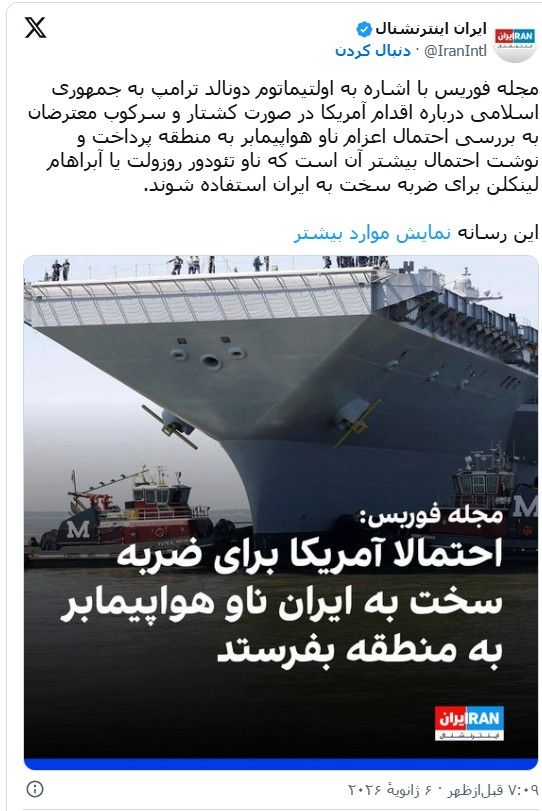 در همین حال، حساب کاربری «دیفنس اینتلیجنس» (اطلاعات دفاعی) شنبه در شبکه اجتماعی ایکس، با اشاره به اعزام ناو هواپیمابر آبراهام لینکلن به سوی خاورمیانه، نوشت دومین ناو هواپیمابر ایالات متحده، جورج اچ. دبلیو. بوش نیز به سوی آبهای مدیترانه در حرکت است.