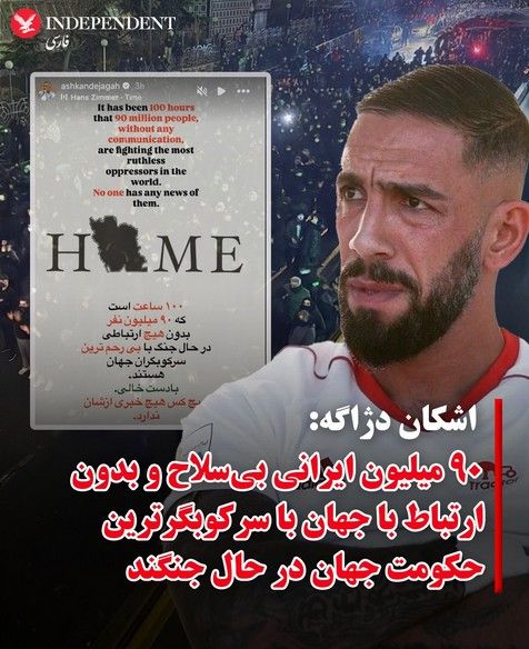 اشکان دژاگه حکومت جمهوری اسلامی را "بیرحمترین سرکوبگران جهان" خوانداشکان دژاگه، کاپیتان پیشین تیم ملی فوتبال ایران، با انتشار یک استوری در شبکه اجتماعی اینستاگرام با ابراز پشتیبانی از خیزش مردمی علیه نظام جمهوری اسلامی، حکومت ایران را "بیرحمترین سرکوبگران جهان" خواند.او همچنین به قطع کامل اینترنت در ایران واکنش نشان داد و نوشت: «۱۰۰ ساعت است که ۹۰ میلیون نفر بدون هیچ ارتباطی در حال جنگ با بیرحمترین سرکوبگران جهان هستند. با دست خالی. هیچکس هیچ خبری از آنها ندارد.»