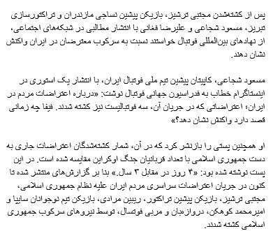 پیشتر مسعود شجاعی، ملیپوش سابق فوتبال ایران نیز پس از کشتهشدن مجتبی ترشیز، بازیکن پیشین نساجی مازندران و تراکتورسازی تبریز، با انتشار مطالبی در شبکههای اجتماعی، از نهادهای بینالمللی فوتبال خواسته بود نسبت به سرکوب معترضان در ایران واکنش نشان دهند.او با انتشار یک استوری در اینستاگرام خطاب به فدراسیون جهانی فوتبال نوشت: «درباره اعتراضات مردم در ایران؛ اعتراضاتی که در جریان آن، سه فوتبالیست نیز کشته شدند. فیفا چه زمانی قصد دارد واکنش نشان دهد؟»